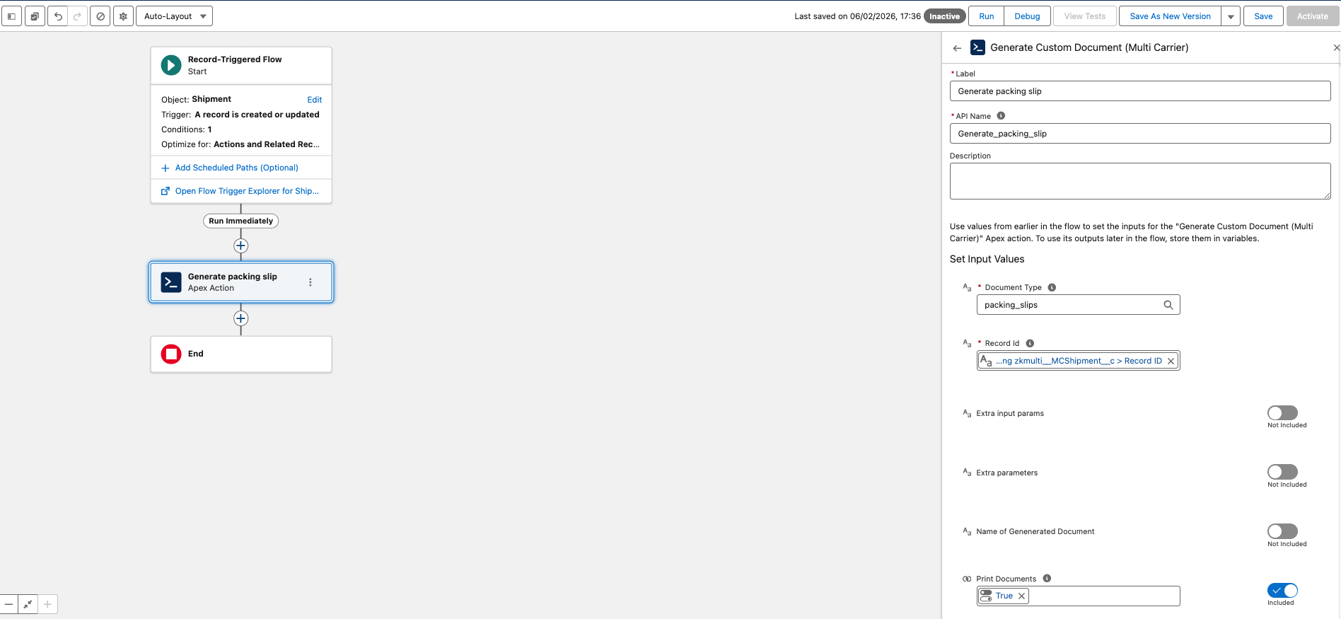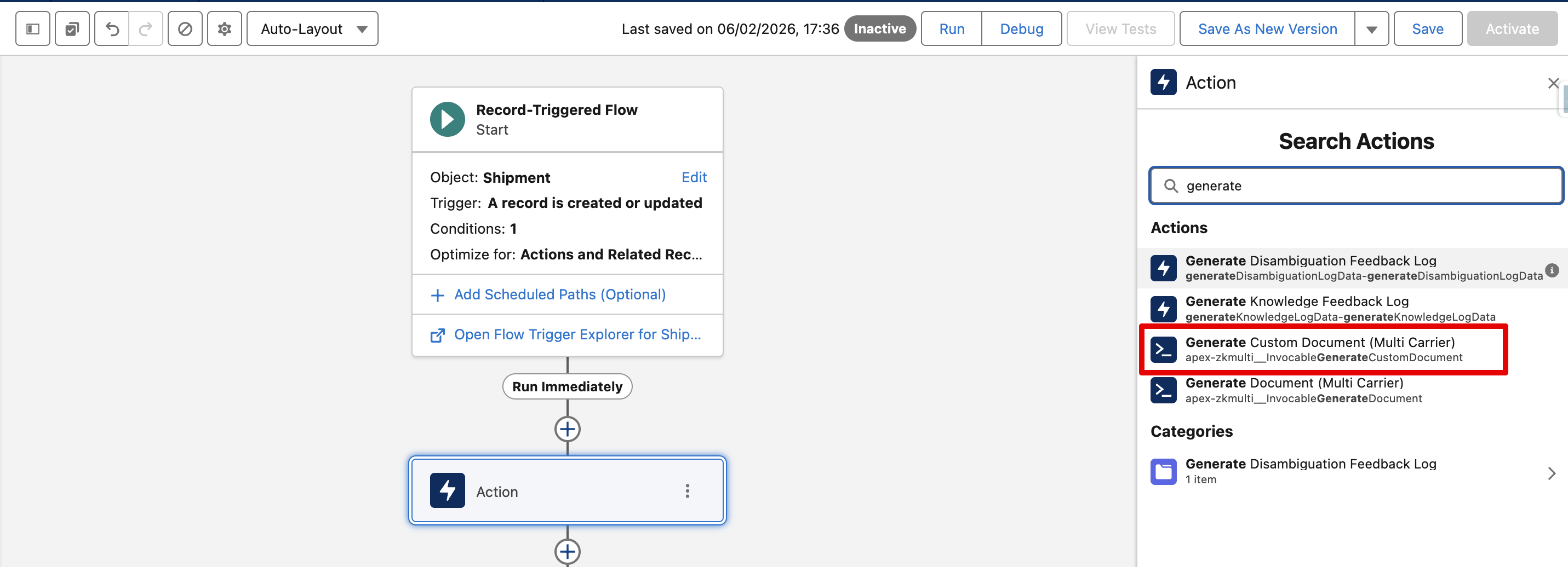 Next add an immediate action with Apex action "Generate Custom Document (Multi Carrier)". This is an expanded version of the "Generate Document (Multi Carrier)" action.