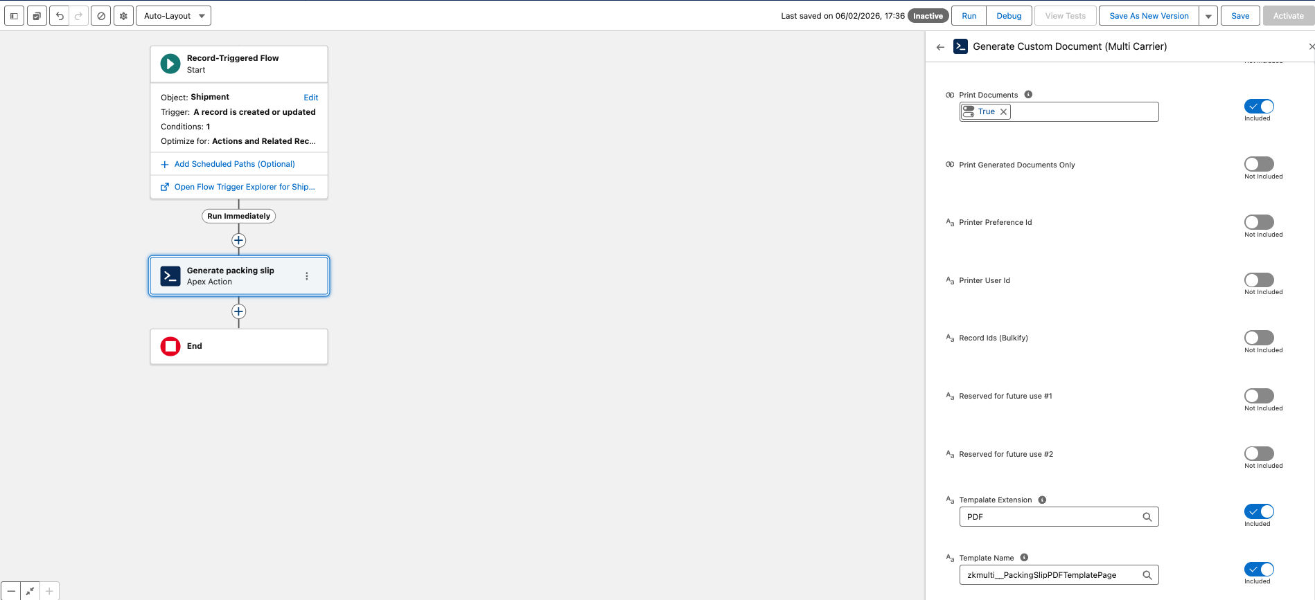 In this example we are using a standard PDF template and setting the auto printing to true. This means that once the packing slip is generated it will be printed automatically.