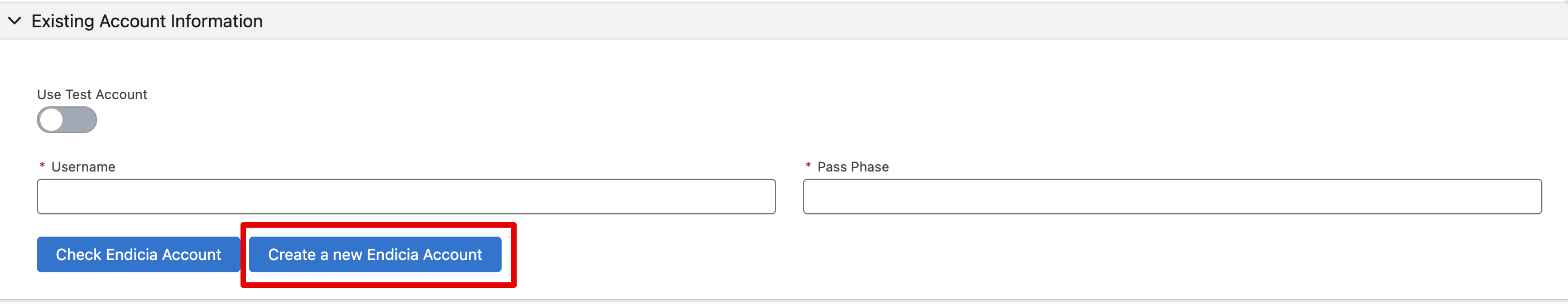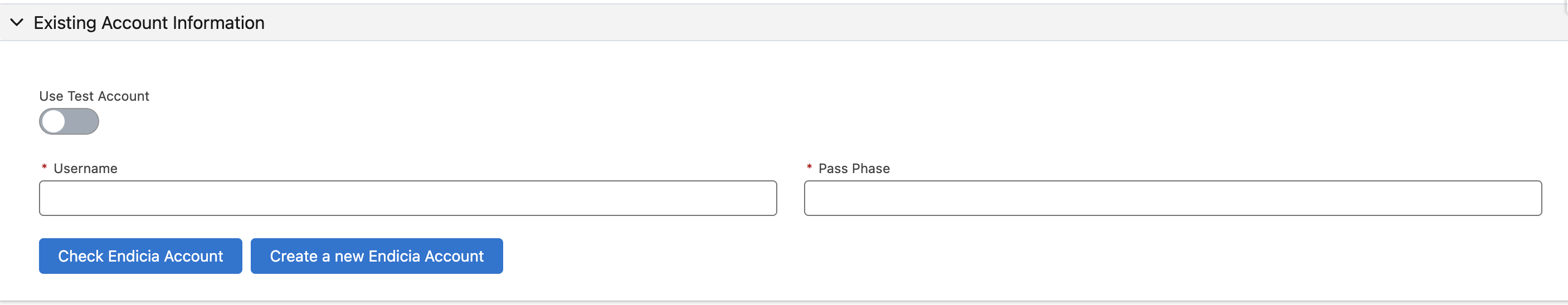 You need to set up an Endicia account to be able to create USPS labels, or if you already have an Endicia account through our app then all you need is your Username and Pass Phrase.