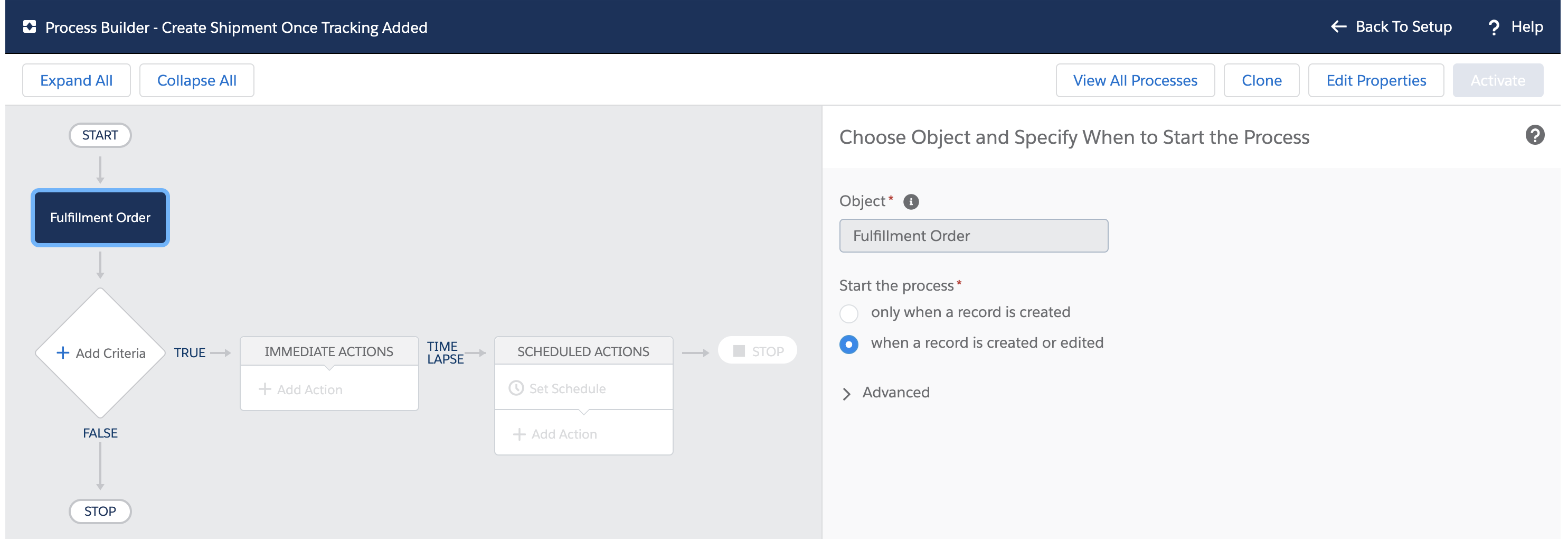 Next choose the object you are starting the process from. Remember in this guide, we are using the Fulfillment Order object, and we will be running the shipment creation once the Fulfillment Order object has the Tracking Number and Ship Dates filled.