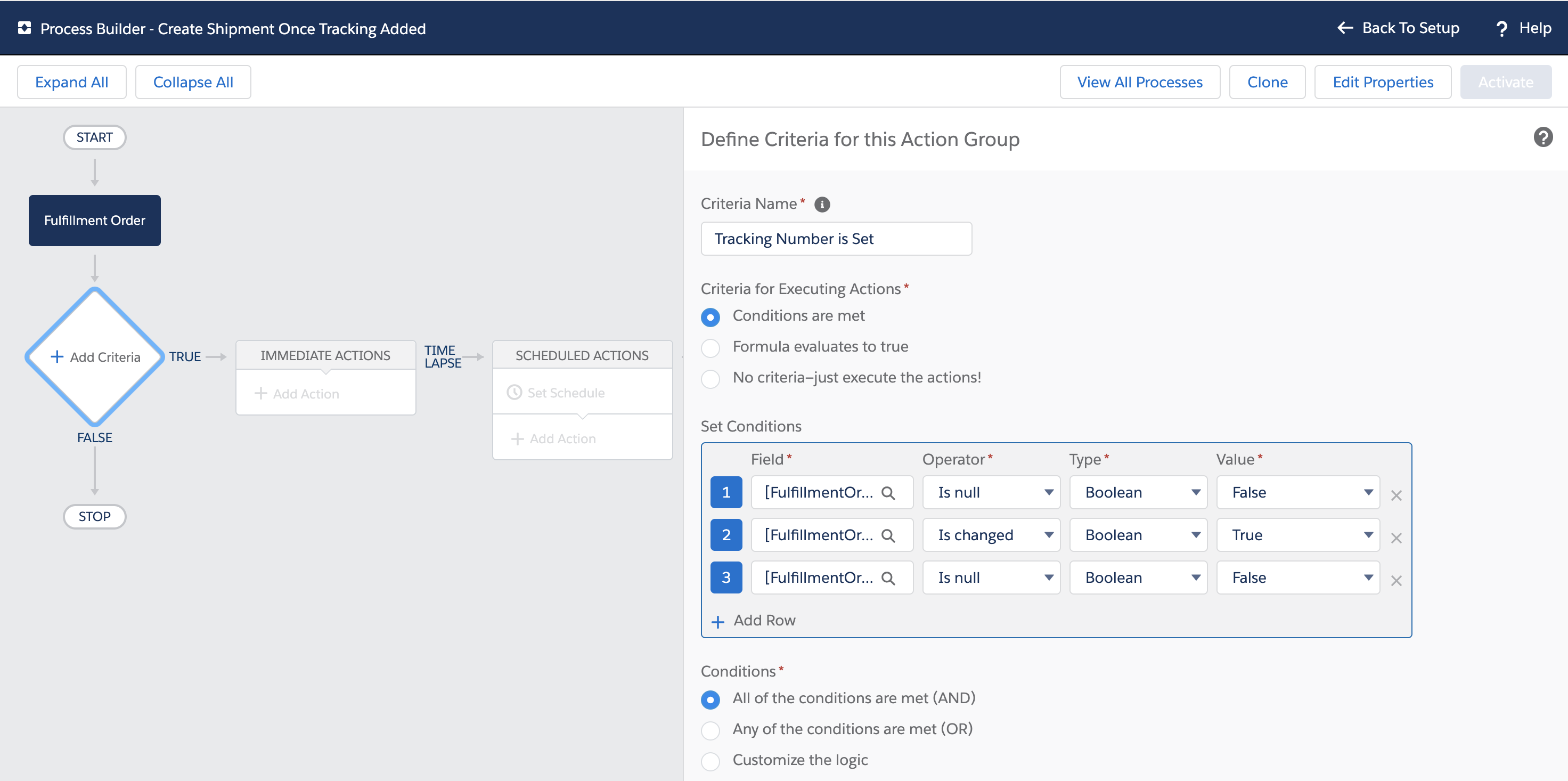 Once you have activated the process builder, go to an Fulfillment Order object, add the tracking number and ship date and the shipment will be auto-created.