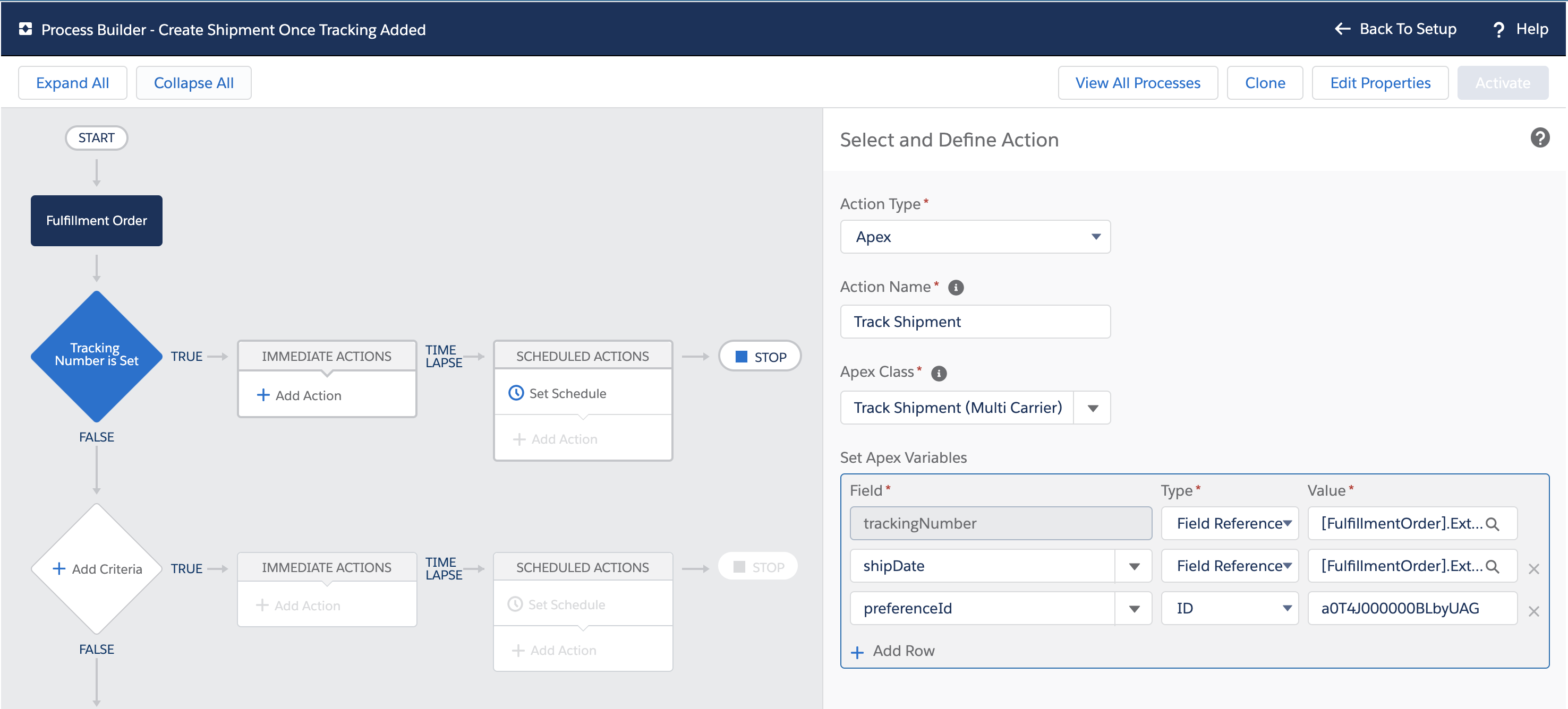 Next add an Immediate Action. The Action Type will be "Apex", and the Apex Class will be "Track Shipment".